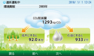 発電量から火力発電等で発電した場合に置き換えてCO2削減量を算出し、さらに樹木の本数や石油の削減量を表示。1時間、1日、1ヶ月、そして1年ごとに具体的な貢献度を確かめられます。