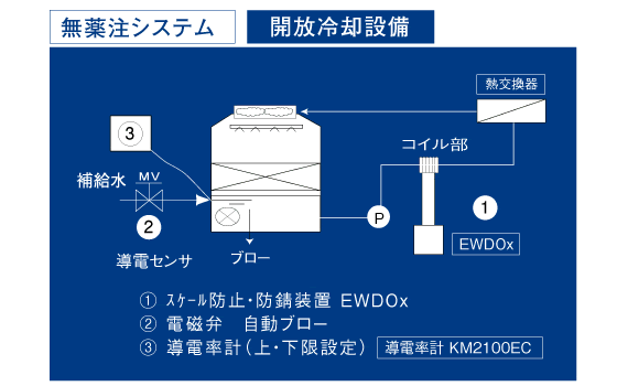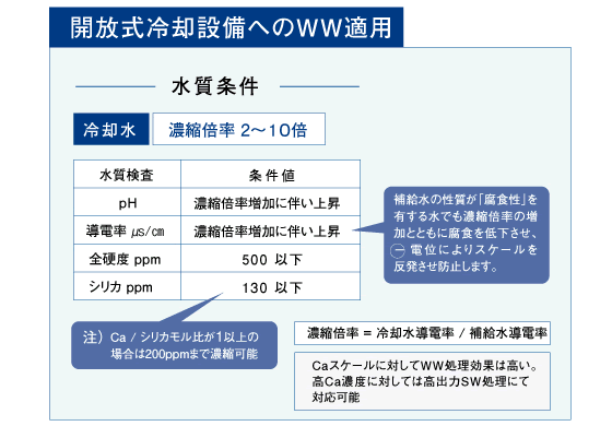 100〜10,000Hzの交流電磁界を変換器よりケーブルに与えるとマイナス帯電水となる。カルシウムのプラス表面電位にマイナス電位の陰イオン(シリカ、塩素、硫酸根など)が特異吸着しカルシウムをマスキングします。その結果、管壁のマイナスと同符号のマイナスにより反発分散し、スケールを防止すると共に、還元作用により防錆を行います。次亜塩素酸ソーダを併用によりカルシウムの回りに塩素イオンが電気的に結合するため、殺菌力が持続されます。