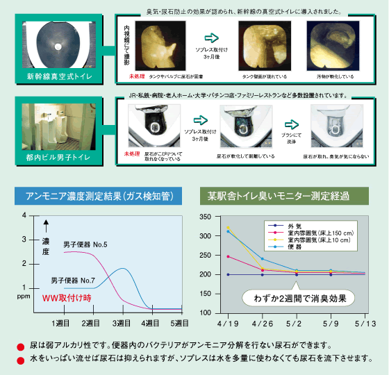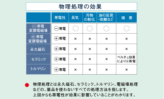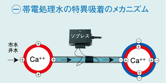 100〜10,000Hzの交流電磁界を変換器よりケーブルに与えるとマイナス帯電水となる。カルシウムのプラス表面電位にマイナス電位の陰イオン(シリカ、塩素、硫酸根など)が特異吸着しカルシウムをマスキングします。管壁のマイナスと同符号のマイナスにより反発分散し、スケールを防止すると共に、還元作用により防錆を行なう。尿石のカルシウムの回りのマイナス電位はそれぞれ反発し、軟化が見られる様になり、同時に臭いも低下します。